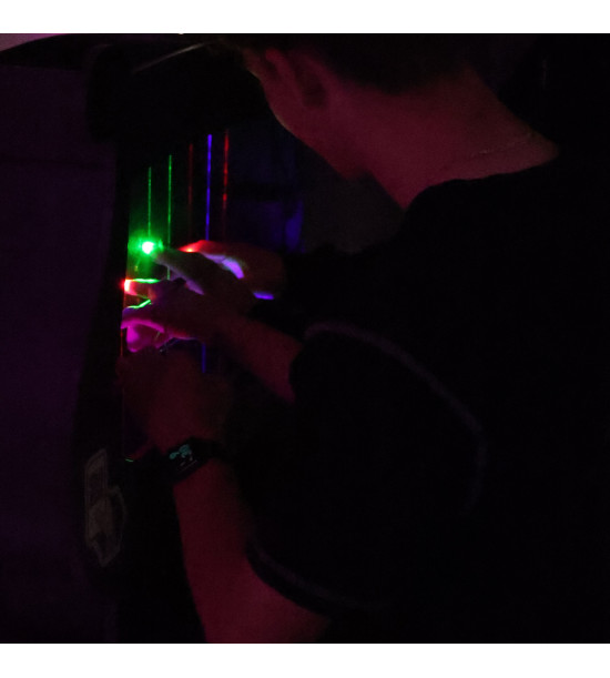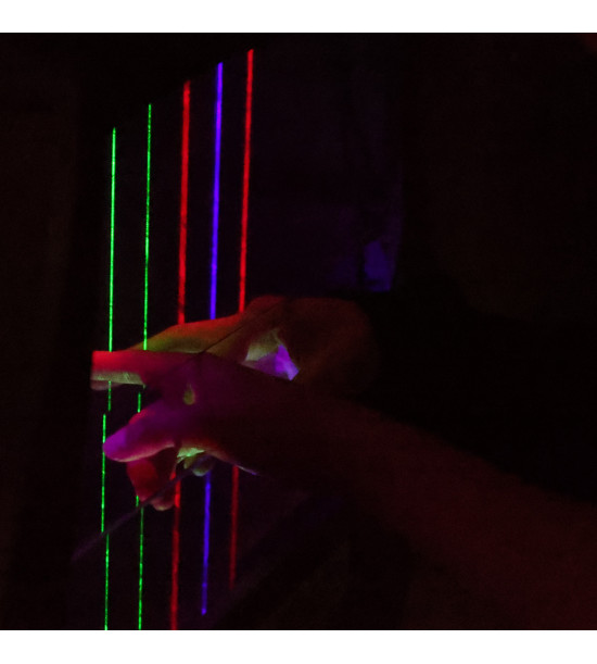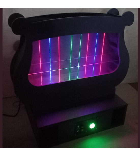 Za skleněným krytem – s výřezem pro vložení rukou – jsou od okolí odděleny svazky laserových paprsků malého výkonu. Přerušením toku jejich světla je generován tón podle klasické hudební stupnice. Paprsky, zviditelněné umělým oparem, vizuálně zastupují struny, funkčně spíše klávesy. Účastník si zahraje melodii, nebo méně muzikální pouze vyvolává tóny. Výběr zvuků lze měnit ve značném rozsahu iniciačním tlačítkem. Od hudebních tónů, přes přírodní, po technickou akustiku. Pokud skříňka není déle obsluhou používána, vyvíječ páry z fluidní kapaliny se uspí.
