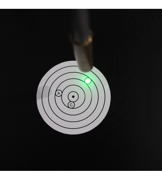 Bezpečný laserový ukazatel (nahraditelný pevnou koncovkou, ukazovátkem) mířící do terče na základně.