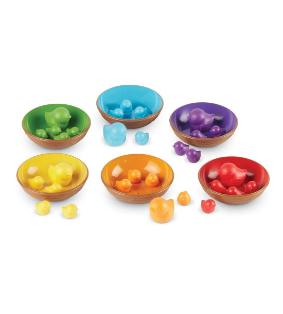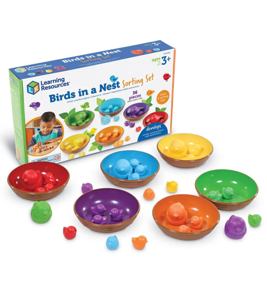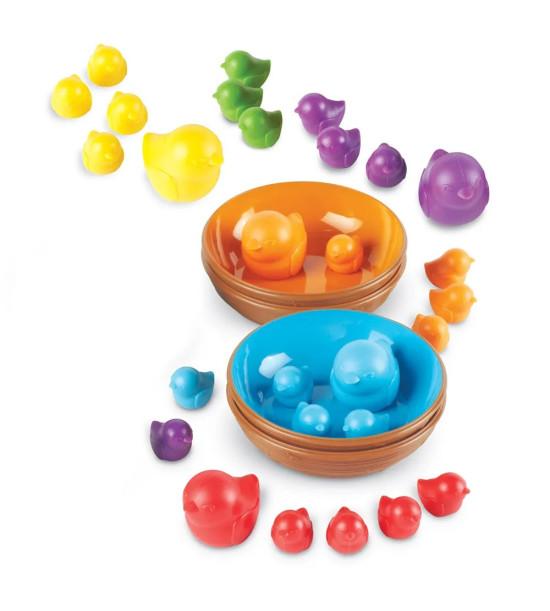 Praktická, poutavá souprava ve veselých barvách pro rozvíjení raných matematických aktivit. Ideální pro procvičování rozpoznávání barev, třídění, počítání, porovnávání. Plastová třídící sada obsahuje 6 barevně rozlišených misek (ptačích hnízd) v barvách: zelená, modrá, fialová, žlutá, oranžová, červená. V každém hnízdě je 5 ptáčků (1 máma a 4 mláďata) stejné barvy.