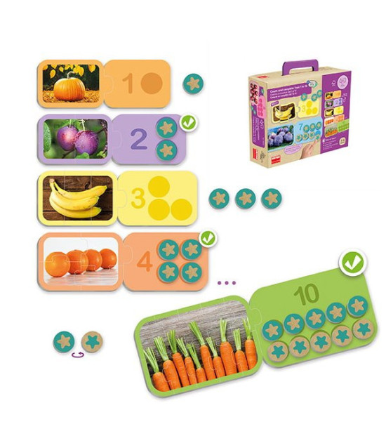 Cílem hry je naučit se počítat od 1 do 10; znát, že každé číslo lze rozdělit na více menších; rozvíjet schopnost pozorování a soustředění; zlepšovat jemnou motoriku správným skládáním dílků puzzle; rozšiřovat si základní slovní zásobu související s obrázky. Balení obsahuje 10 puzzle (18 x 12 cm); 10 karet s obrázky (18 x 12 cm); 60 žetonů.