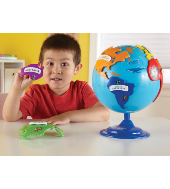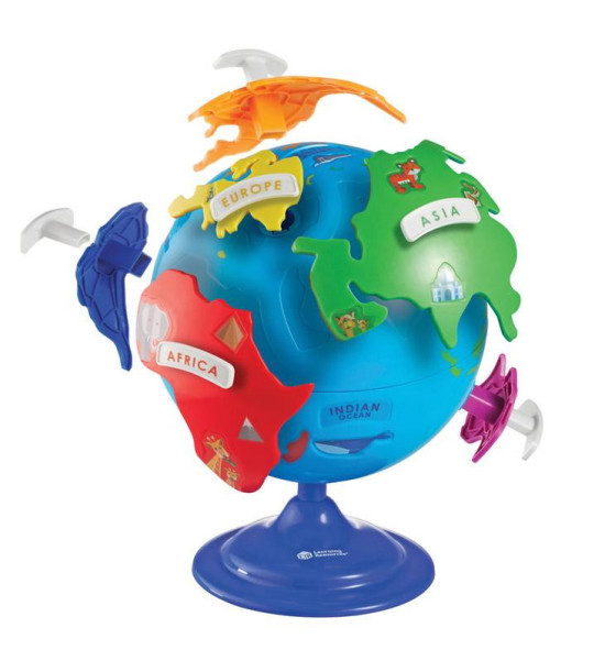 Barevný glóbus s vyjímatelnými kontinenty, je skvělou pomůckou při základech geografie. Na každém dílku je vyobrazena typická historická památka a zvíře žijící v dané oblasti. Průměr 20cm.