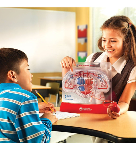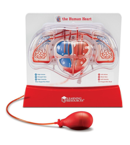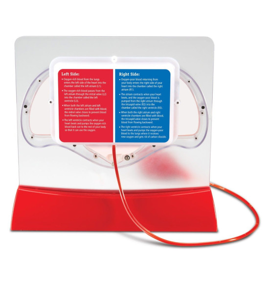Model ukazuje jednoduchým způsobem, jak spolupracuje srdce a plíce při zásobování těla kyslíkem. Model je průhledný a zobrazuje žíly, tepny, srdeční komory a plíce. Balení obsahuje 10 balíčků s barvivem, pomocí kterých se znázorní tok krve. Rozměr: 30 x 27 cm.