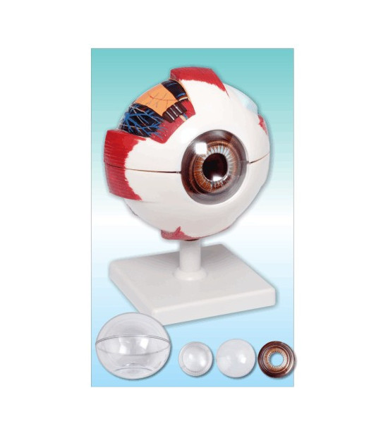6 násobně zvětšený model oka vůči lidskému oku přináší velmi detailní zobrazení. Je rozdělen na 6 částí: vnější a vnitřní vrstva, sklivec, čočka, duhovka a rohovka. Celý model je umístěn na stojanu. Rozměry: průměr 16cm, výška 21cm.